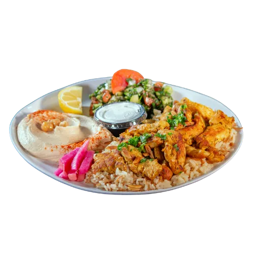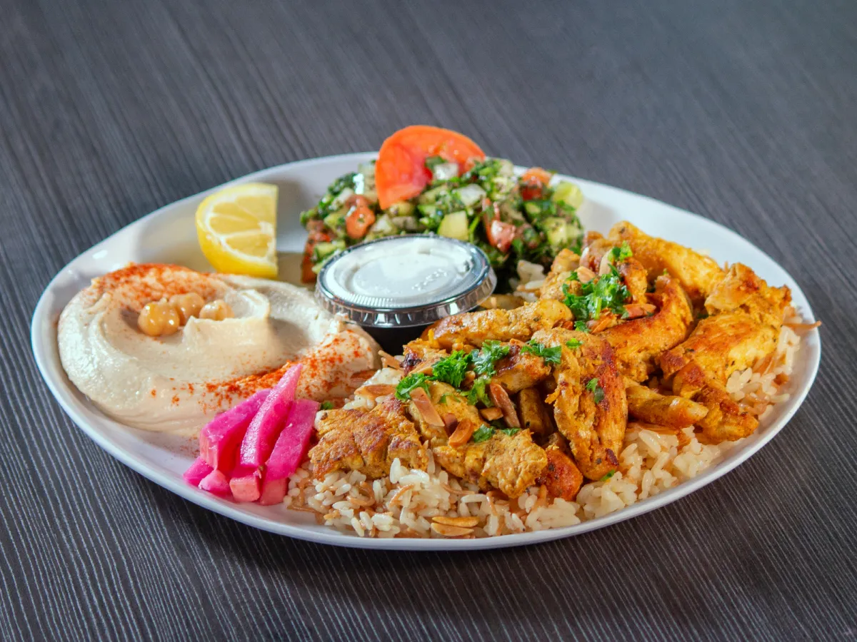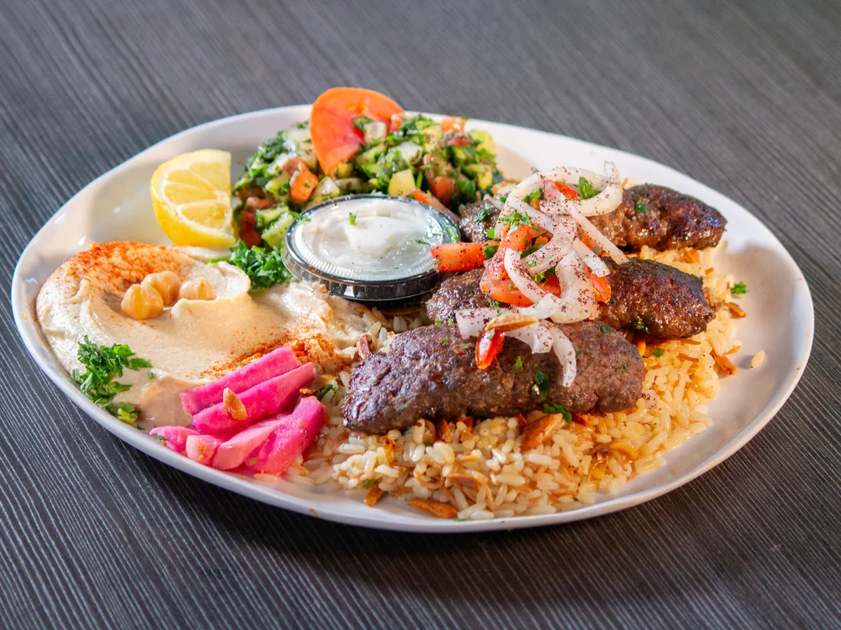 rice with almonds, beef Shawarma, chicken shawarma, kafta kabob, hummus, 1pc falafel & BREAD.