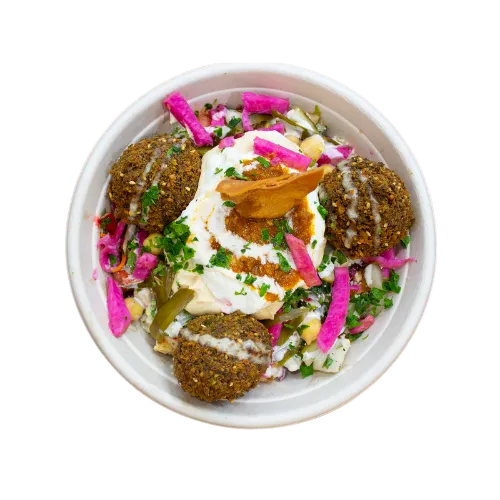 Pick a protein, load it up with toppings, add sauce, and enjoy!